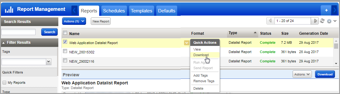 2) Select a report format and start the download. Tip - Once you click Download you can safely move on to other activities.